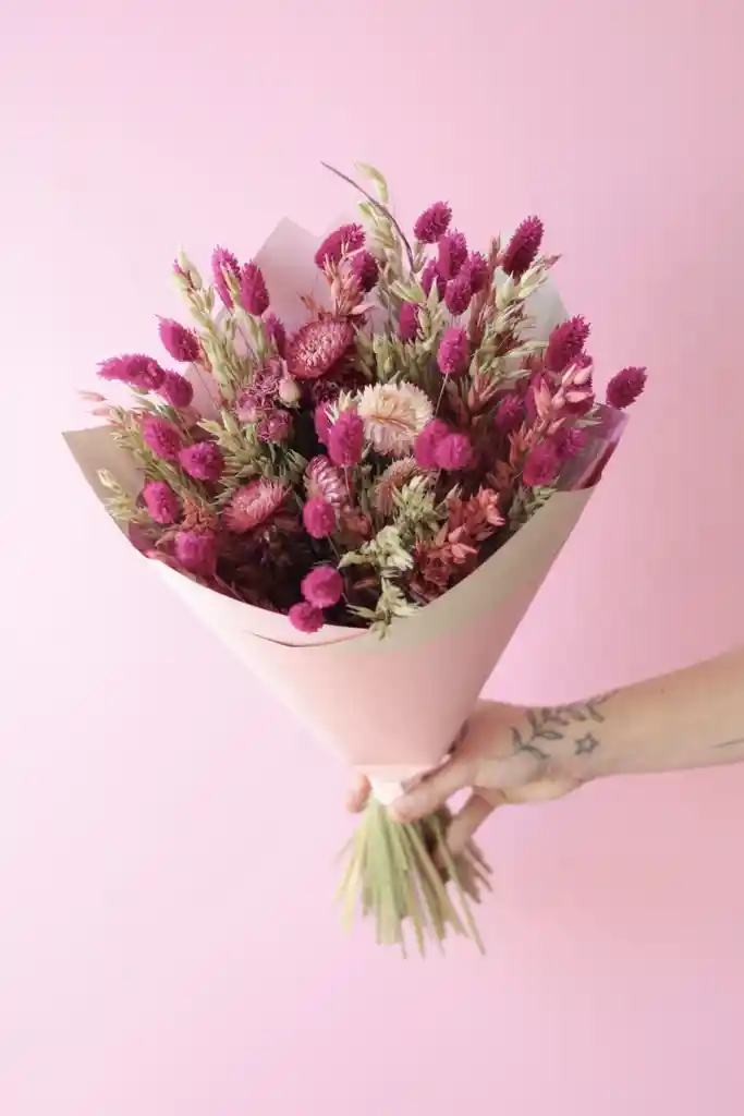 Este ramo es ideal para todas aquellas personas que les gustan los tonos rosados. Incluye un mix de flores secas holandesas en tonos rosados, fucsias, verdes, beige y neutros. Largo aproximado 45 cms. Todos nuestros productos secos y preservados han sido cuidadosamente seleccionados e importados desde Holanda para ti. Además todos han sido cultivados, cosechados y producidos de manera manual para garantizar la mejor calidad y color, respetando las normativas eco-sustentables europeas. Nuestros productos pueden durar varios años si se cuidan de la manera correcta evitando el sol directo, cambios de temperaturas muy abruptos, exposición a espacios húmedos, contacto directo con el agua, inadecuada manipulación, entre otros.