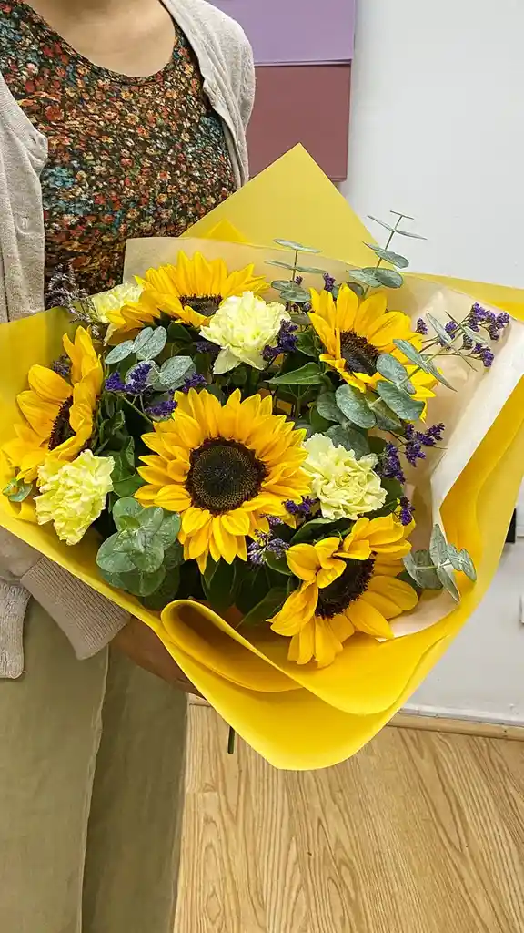 Ramo tamaño medio que incluye 5 girasoles y florecitas blancas. Todo envuelto en un delicado papel a combinación de los girasoles