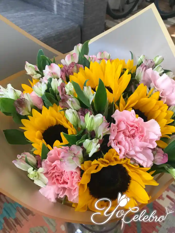 Ramo girasoles y claveles con Charmelias de color Multicolor ideal para el Felicitaciones