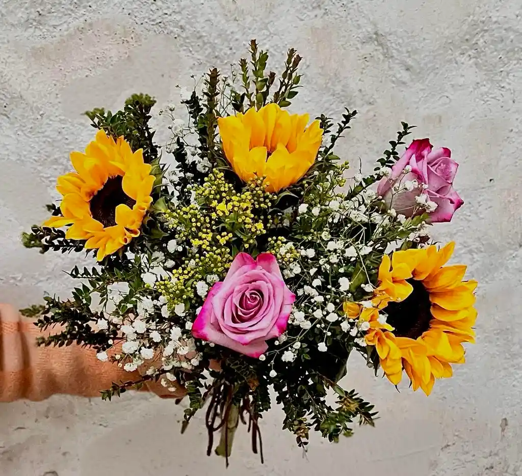 Ramo de tres girasoles y dos rosas mas varas de gypsophila y follaje verde de la estación, todo envuelto en papeles y cintas importadas