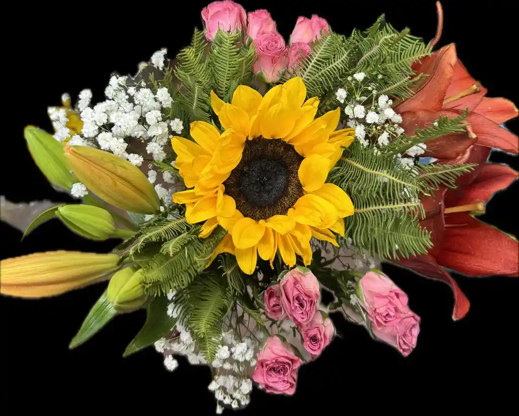LILIUM- MINI ROSAS -GIRASOL ,GYPSOPHILA -FOLLAJE ENVUELTO EN DELICADO PAPEL