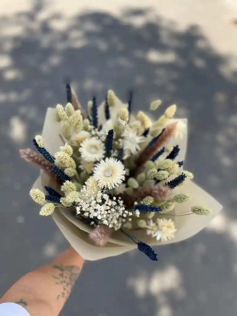 Este ramo es ideal para las personas eclécticas y elegantes. Incluye un mix de flores secas holandesas en tonos azules, verdes y blancos. Largo aproximado 30 cms. Todos nuestros productos secos y preservados han sido cuidadosamente seleccionados e importados desde Holanda para ti. Además todos han sido cultivados, cosechados y producidos de manera manual para garantizar la mejor calidad y color, respetando las normativas eco-sustentables europeas. Nuestros productos pueden durar varios años si se cuidan de la manera correcta; evitando el sol directo, cambios de temperaturas muy abruptos, exposición a espacios húmedos, contacto directo con el agua, inadecuada manipulación, entre otros.