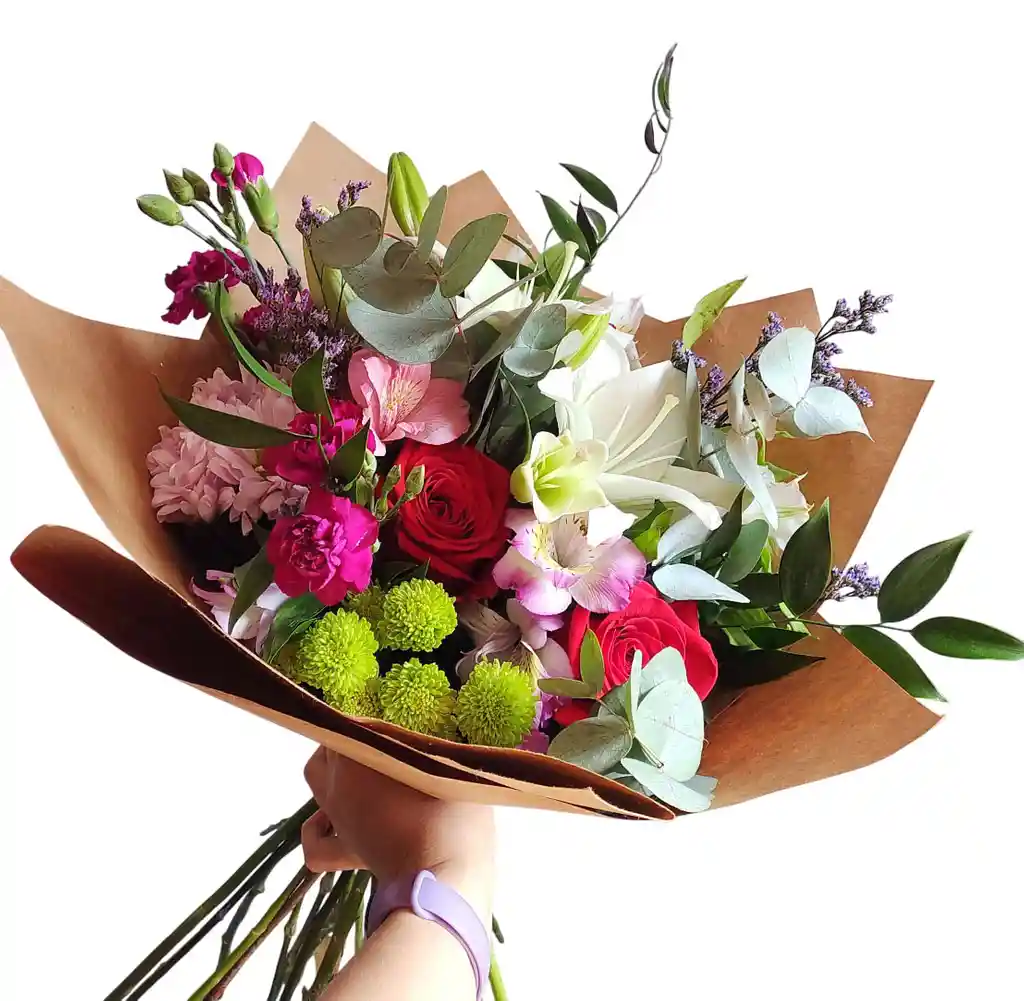 Ramo con 24 Varas de flores de estación y follaje. La imagen es referencial, los colores y las flores pueden variar según disponibilidad.