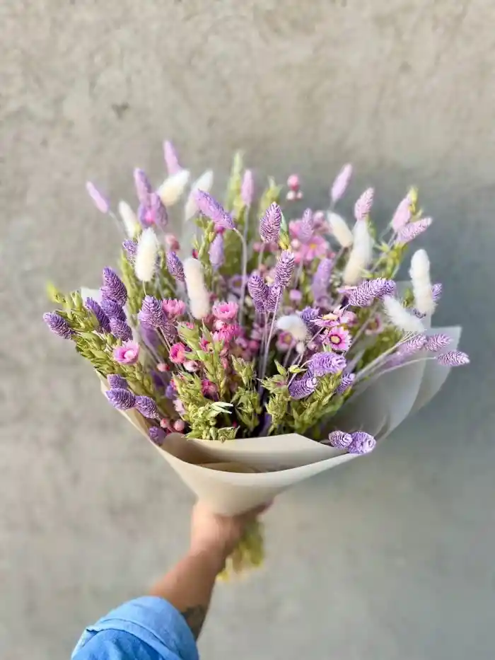 Este ramo es ideal para las personas dulces y alegres. Incluye un mix de flores secas holandesas en tonos rosados, lavandas, blancos y verde. Largo aproximado 40 cms. Todos nuestros productos secos y preservados han sido cuidadosamente seleccionados e importados desde Holanda para ti. Además todos han sido cultivados, cosechados y producidos de manera manual para garantizar la mejor calidad y color, respetando las normativas eco-sustentables europeas. Nuestros productos pueden durar varios años si se cuidan de la manera correcta; evitando el sol directo, cambios de temperaturas muy abruptos, exposición a espacios húmedos, contacto directo con el agua, inadecuada manipulación, entre otros. *Por tratarse de un producto natural, al igual que nuestros ramos de flores frescas, nunca habrán dos ramos exactamente iguales.