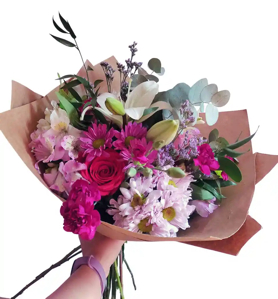 Ramo de 18 Varas con flores de estación y follaje. La imagen es referencial, los colores y las flores varian según disponibilidad.