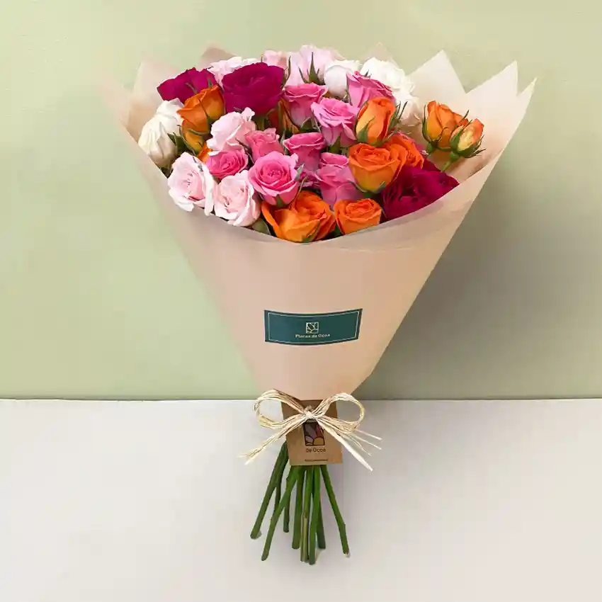 Ramo alegre y romántico compuesto por Mini Rosas, una mezcla entre colores pasteles y cálidos ¡Este 14 de febrero, sorprende a tu amor con este hermoso ramo de flores!.