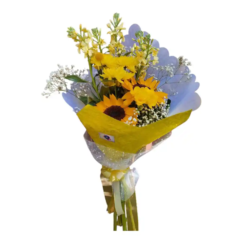 Ramo mix de flores amarillas que lleva girasoles, Alelís, ilusiones, Fresia y mables.