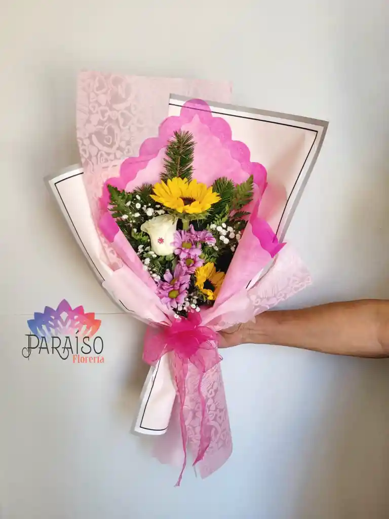 Ramo mix con 5 flores. Incluye follaje, papeleria y tarjetita. de color Amarillo ideal para el Agradecimiento