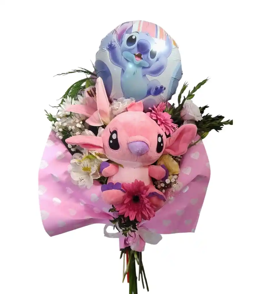 Ramo con mix de flores, Angela y globo del personaje. Envoltorio en papel coreano y lazo.