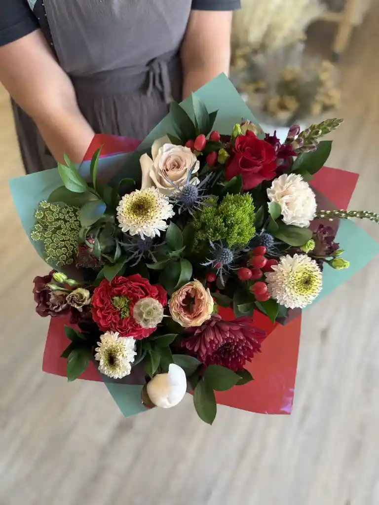 Ramo incluye entre 30 a 35 varas de flores frescas y follajes del día en tonos Navideños envuelto en papel del día. Sorpréndete con la paleta de NAVIDEÑA del día, nosotros elegimos por ti las flores más lindas y frescas. Los tonos Navideños pueden variar entre burdeos, ocres, blancos, rojos, damascos, verdes y/o rosados.