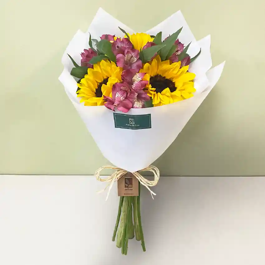Ramo compuesto por 3 Girasoles en compañía del frescor de las alstroemerias ¡Este 14 de febrero, sorprende a tu amor con este hermoso ramo de flores!.