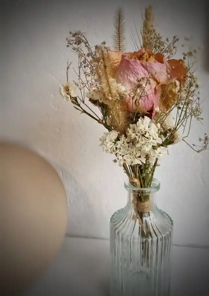 Ramito petit de 15 x 20 cms con florero de vidrio tipo mini botella (14 x 5 cms) en caja de regalo. La imagen es referencial, las flores secas tienen un tono envejecido, el ramo es pequeño en colores mixtos. Las flores secas duran años! Evita exponer el ramo al sol o tocarlo demasiado. Nuestras flores tienen un protector mate, sin embargo con el paso del tiempo pueden perder color.