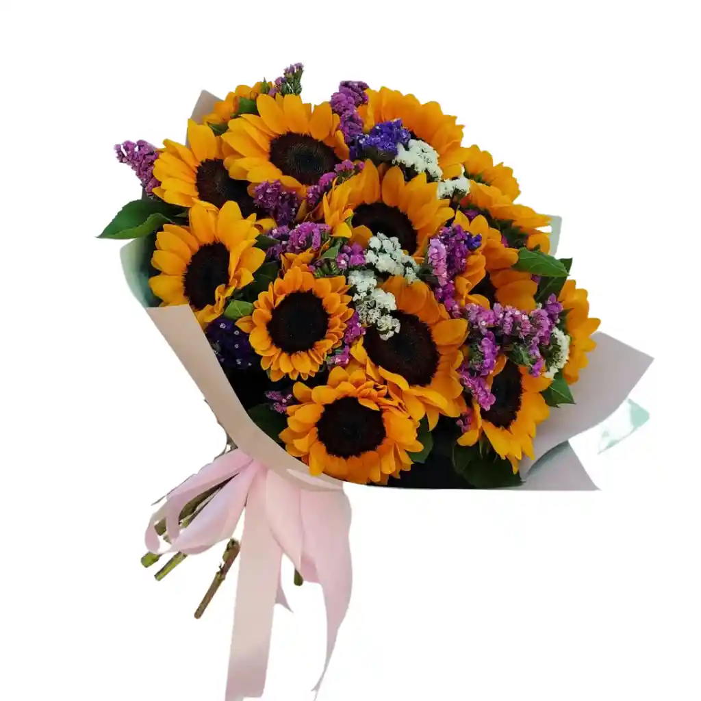 Gran Ramo de 8 girasoles y abundante follaje de flores siemprevivas e ilusiones, envuelto en papel de seda y cinta de satin, incluye tarjeta de cortesia, nos puedes enviar el mensaje que desees agregar. de color Amarillo ideal para el Agradecimiento