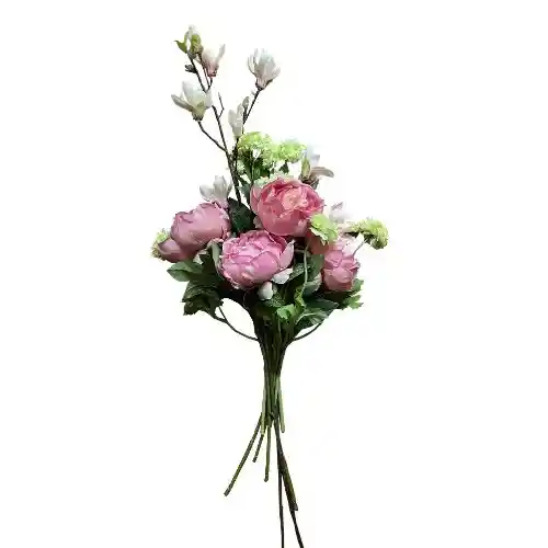 Contiene 4 Peonías rosada, 1 Mini magnolia rosada, 2 varas de Ranúnculo doble green, 1 Bola de nieve light green