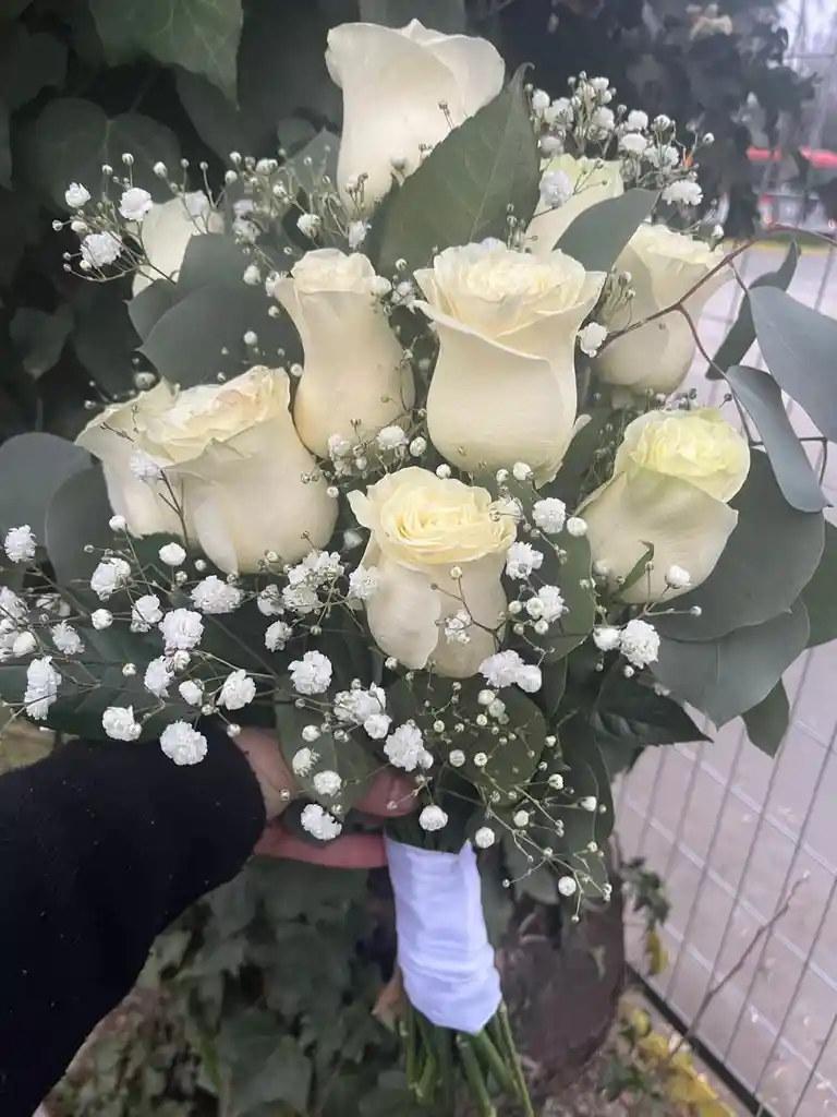 Ramo rosas blancas, Incluye 10 rosas con gypsophila y follaje verde presentación papel de arroz y amarra de rafia.