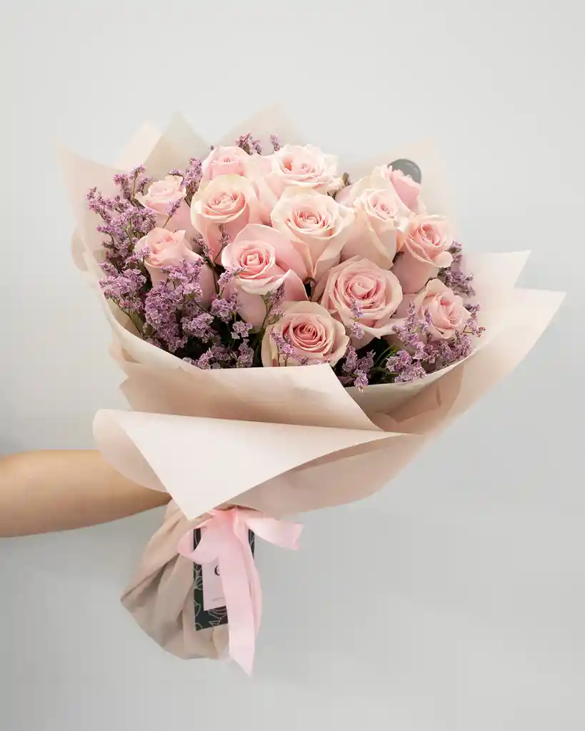Ramo de flores confeccionado con 18 rosas importadas rosadas mas leady