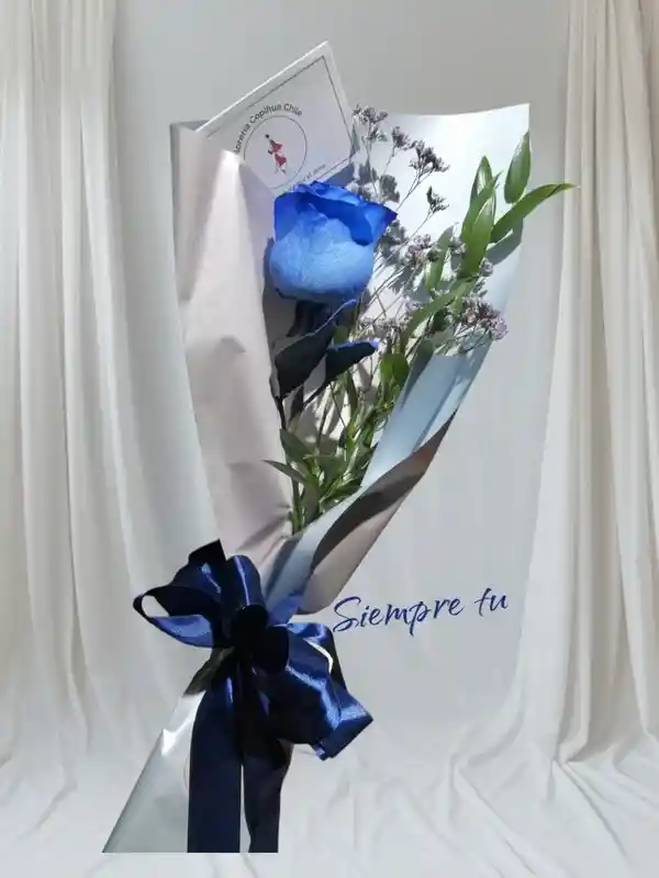 "La esencia de un amor único, expresada en una sola rosa azul". Un detalle declinado y elegante que habla por sí solo: Una rosa azul importada, símbolo de lo extraordinario y único, acompañada de follajes frescos y envuelta en un papel metálico que resalta su belleza. El lazo satinado aporta el toque final de distinción. Ideal para sorprender en aniversarios, citas especiales o simplemente recordarle a esa persona cuanto significa en tu vida. incluye tarjeta personalizada.