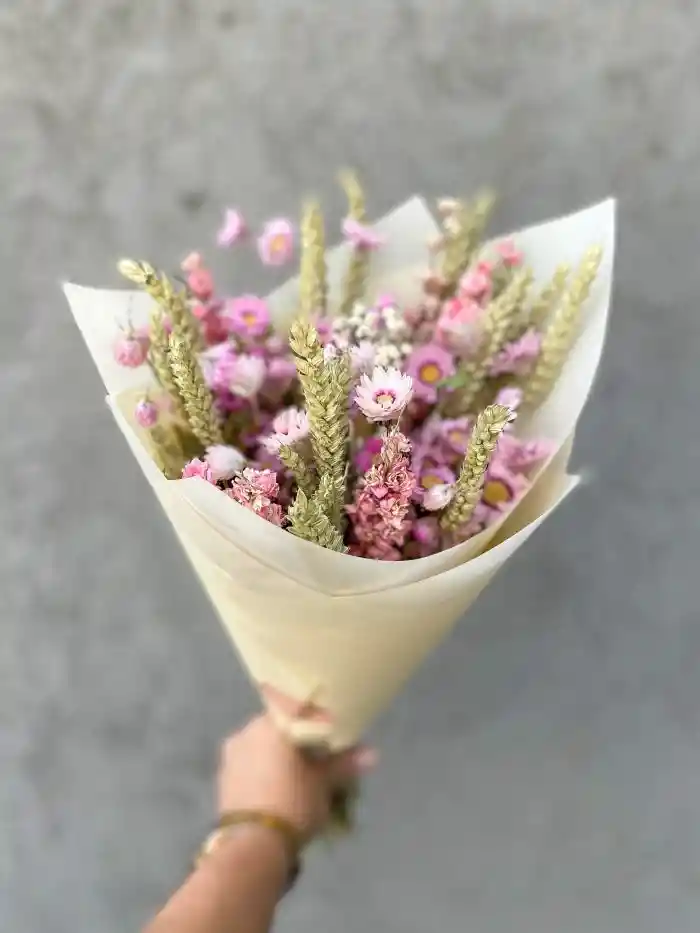 Este ramo es ideal para las personas dulces y que les gusta el estilo silvestre. Incluye un mix de flores secas holandesas en tonos rosados, verdes y blancos. Largo aproximado 40 cms. Todos nuestros productos secos y preservados han sido cuidadosamente seleccionados e importados desde Holanda para ti. Además todos han sido cultivados, cosechados y producidos de manera manual para garantizar la mejor calidad y color, respetando las normativas eco-sustentables europeas. Nuestros productos pueden durar varios años si se cuidan de la manera correcta evitando el sol directo, cambios de temperaturas muy abruptos, exposición a espacios húmedos, contacto directo con el agua, inadecuada manipulación, entre otros. *Por tratarse de un producto natural, al igual que nuestros ramos de flores frescas, nunca habrán dos ramos exactamente iguales