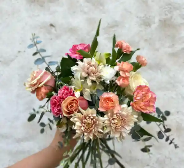 Ramo Silvestre tono pastel. Compuesto con variedad de flores de la estación. Con envoltorio de papel de color y cinta de satín.