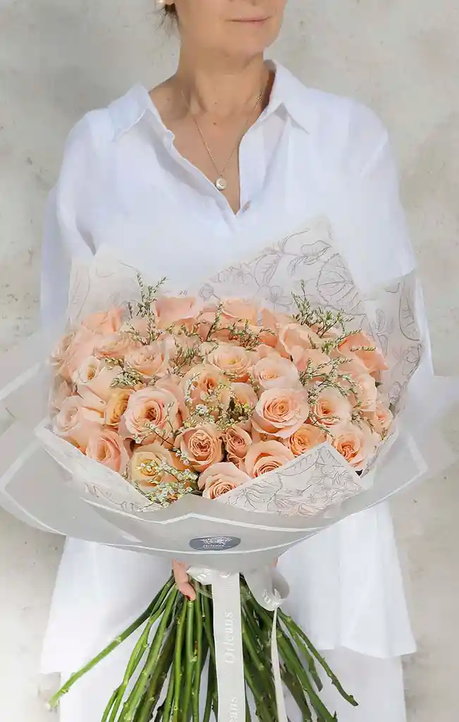 Ramo de 25 rosas en delicado color damasco, acompañadas de limonium o follaje verde de la estación. Seleccionamos personalmente para ti las las flores más bellas del mercado internacional y de los campos chilenos. Todos nuestros ramos incluyen; - Postal para escribir un mensaje de saludo. - Sobre al tono sellado con antigua técnica de sello y lacre. - Sachet de preservante floral para alargar la belleza de tus flores.