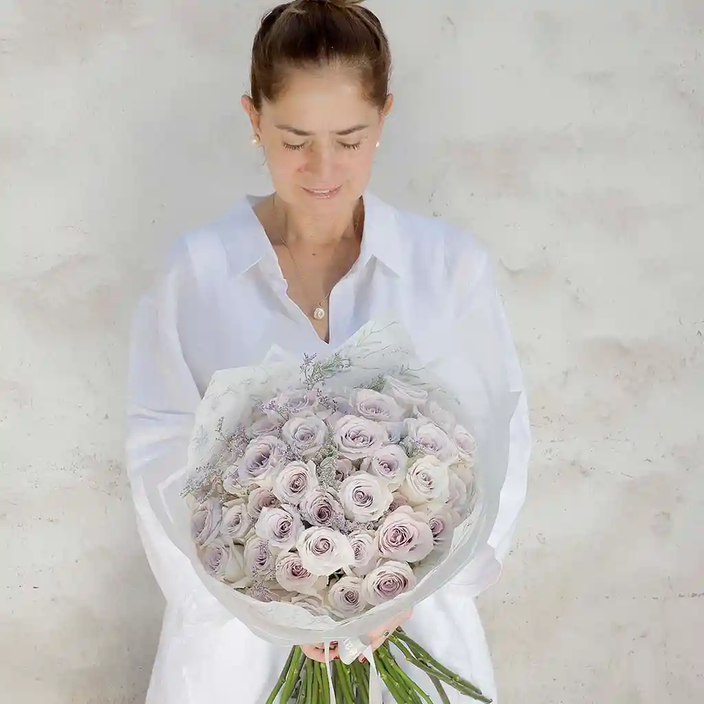 Ramo de 25 rosas en delicado color lila, acompañadas de limonium o follaje verde de la estación. Seleccionamos personalmente para ti las las flores más bellas del mercado internacional y de los campos chilenos. Todos nuestros ramos incluyen; - Postal para escribir un mensaje de saludo. - Sobre al tono sellado con antigua técnica de sello y lacre. - Sachet de preservante floral para alargar la belleza de tus flores.