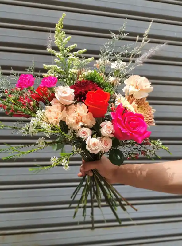 Ramo surtido de la estación con flores mixtas de la temporada acompañada de espigas y pampa grass, envuelto en papeles y cintas al tono. de color Multicolor ideal para el Felicitaciones