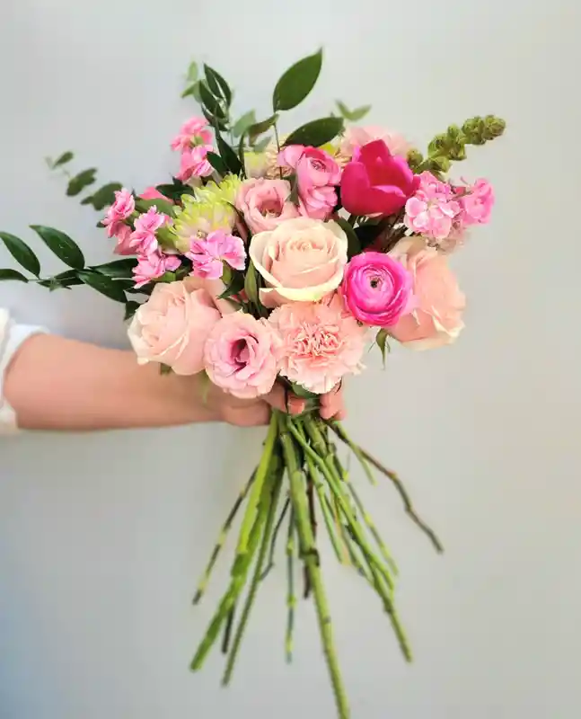 Ramo Surtido con flores de temporada más de 12 varas, acompañan follaje verde de la estación, todo envuelto en papeles y cintas al tono. Foto de referencia.