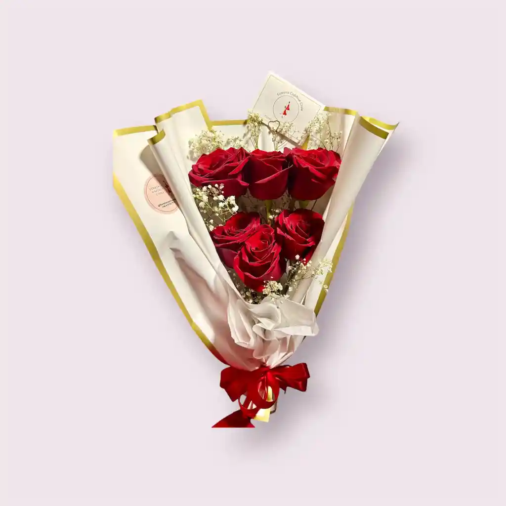 "Un ramo pequeño en numero, pero inmenso en sentimiento" Este romántico ramo esta compuesto por 6 Rosas Rojas Importadas de tallo largo, envueltas en un delicado follaje de gypsophilia blanca, que añade un toque de suavidad y encanto visual. Diseñado para momentos donde las palabras no bastan: Amor, reconciliación o simplemente porque si. Su tamaño lo convierte en una opción elegante, sobria y significativa, ideal para entregar a mano. Acabado con envoltorio fino y lazo de raso. Incluye tarjeta para tu mensaje personalizado.