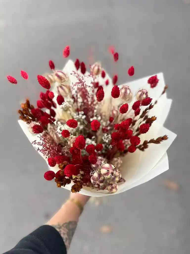 Este ramo inspirado en los colores del tango es ideal para las personas apasionadas. Incluye un mix de flores secas holandesas en tonos rojos, rosados, verdes y blancos. Largo aproximado 40 cms. Todos nuestros productos secos y preservados han sido cuidadosamente seleccionados e importados desde Holanda para ti. Además todos han sido cultivados, cosechados y producidos de manera manual para garantizar la mejor calidad y color, respetando las normativas eco-sustentables europeas.