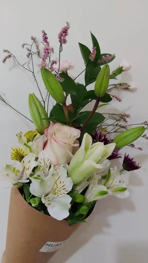 ramo 6 varas de flores blacas y colores claros mas follaje envueltos en papel kraft.