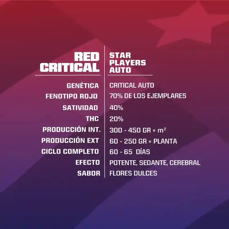 Variedad: automática Cantidad de semillas: 2 Sativa: 40% – Indica 60% Fenotipo rojo: 70% de los ejemplares THC: 19 % aprox Producción Interior: 300-450 g/m² Producción Exterior: 60-250 g/planta Ciclo completo: 60-65 días Efectos: Potente, sedante, cerebral Sabor: flores dulces