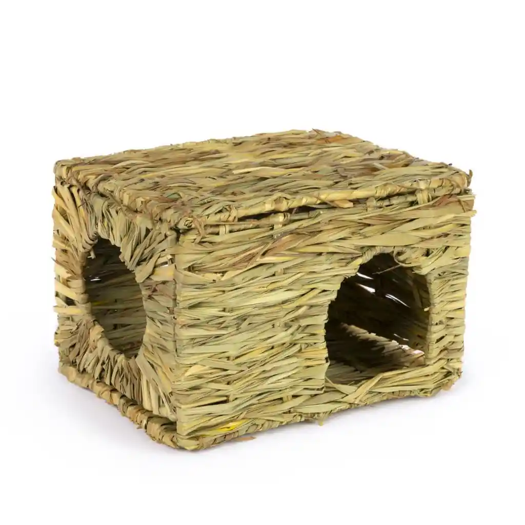 centro de actividades de césped tejido a mano para su pequeño animal. La dulce fragancia de todos los materiales de pasto 100% natural se manifiesta en este divertido accesorio para jugar mientras satisface el instinto natural de su mascota de excavar, explorar y anidar. Nuestro Nature's Hideaway mide aproximadamente 31 cm de largo, 23 cm de ancho y 20 cm de alto. Ideal para un conejillo de indias, un conejo enano o un hurón