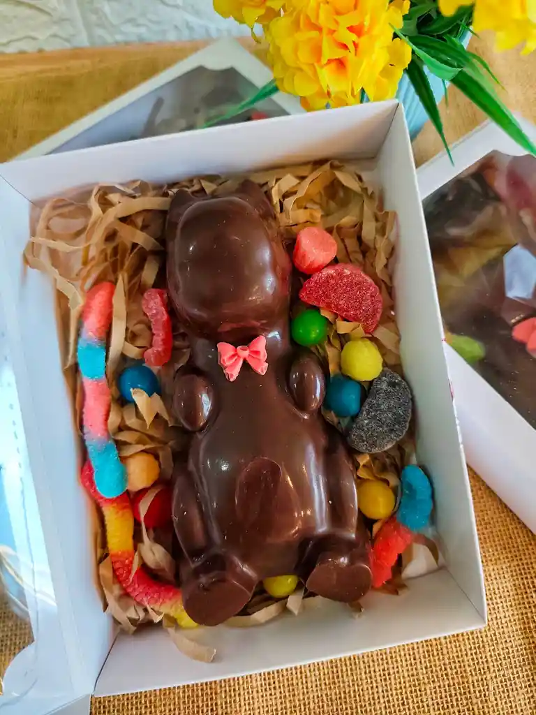 Dinosaurio de chocolate semidulce de 250g apróx para Día del Niño Debajo del chocolate van dulces mas pequeños (5 unidades) Va en una cajita con etiquetas alusivas a la celebración