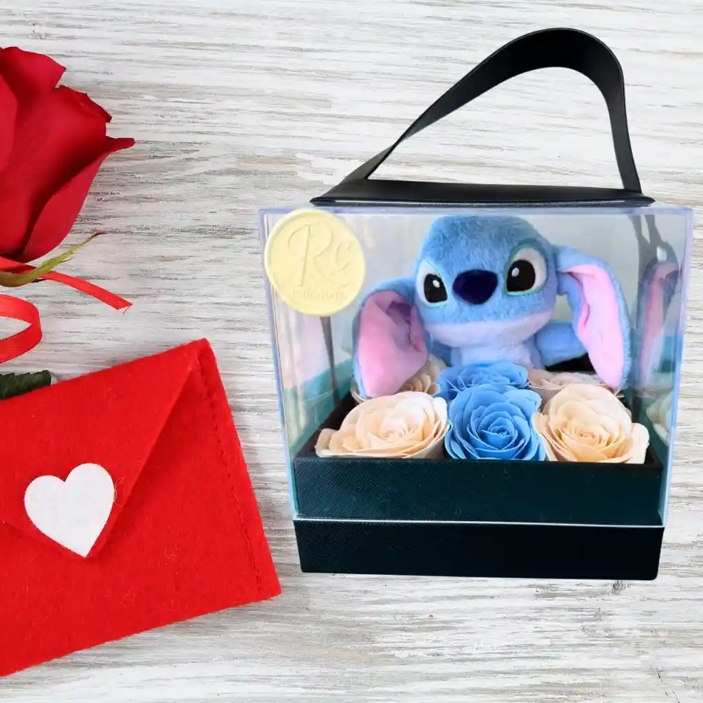¡Sorprende a tu ser querido con este arreglo único y elegante! Caja de Acrílico transparente con base negra y cuerina para un toque de lujo. Incluye 4 flores color champán y 2 flores color azul celeste hechas de jabón con un aroma agradable, suaves y fragantes para un look romántico Peluche de Stitch, el personaje más trendy del momento. ¡Un regalo perfecto para el Dia de las Madres! No te pierdas la oportunidad de demostrar tu amor y cariño con este arreglo exclusivo. ¡Haz que este día sea inolvidable!