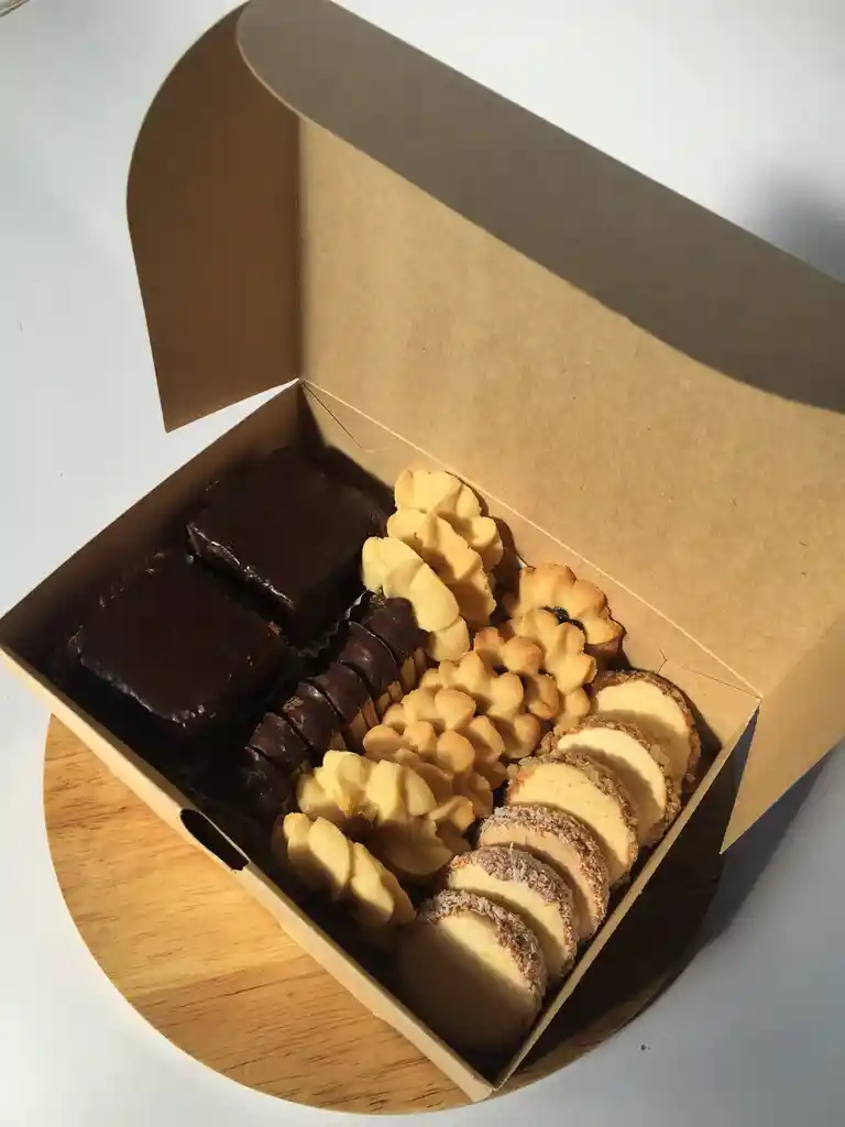 Caja con mix de galletas con chocolate y mermelada, alfajores de maicena de nuez y coco y brownies.