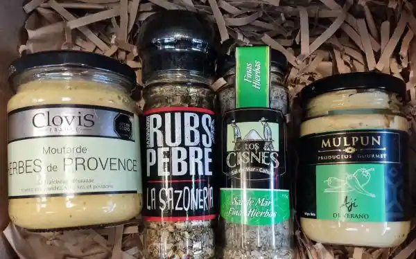 Caja de regalo ecológica reutilizables contiene: Mostaza Clovis, Francia Rubs Las Sazonería Sal de Cáhuil Premium con especias Ají Mulpún de otoño