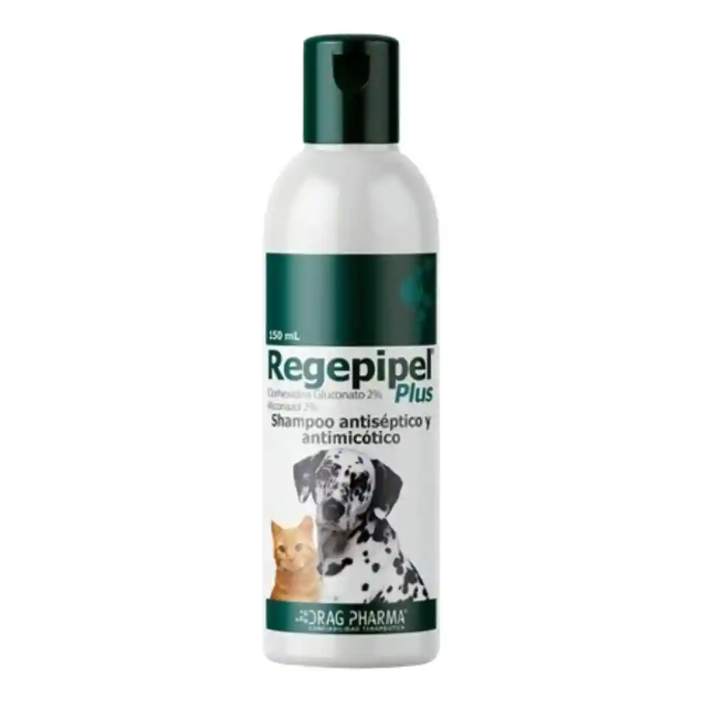 Para el tratamiento de la dermatitis seborreica asociada con infecciones por Staphylococcus intermedius, Malassezia pachydermatis, y como ayuda en el tratamiento de infecciones dermatófitas debidas a Microsporum canis en perros y gatos. Ficha Técnica Shampoo. Shampoo antiséptico y antimicótico. Cada 100 mL contiene: Clorhexidina Gluconato 20%……………………10 g (Equivalente a 2 g de Clorhexidina Gluconato) Miconazol Nitrato……………………………………. 2,3 g (Equivalente a 2 g de Miconazol base) Excipientes c.s.p……………………………………… 100 mL Para el tratamiento de la dermatitis seborreica asociada con infecciones por Staphylococcus intermedius, Malassezia pachydermatis, y como ayuda en el tratamiento de infecciones dermatófitas debidas a Microsporum canis en perros y gatos. Moje al animal con abundante agua. Aplicar una cantidad suficiente del shampoo en varios puntos y masajear. Con la ayuda de una esponja esparcir para favorecer su penetración en la piel y el pelaje. Asegúrese de aplicar Regepipel® Plus alrededor de los labios, bajo la cola y entre los dedos por ser aquellas áreas reservorios de agentes causales. Dejar actuar por 10 a 15 minutos, luego enjuagar con abundante agua limpia. Repetir dos o tres veces por semana hasta que los síntomas disminuyan y luego una vez por semana o según indicación del Médico Veterinario. Perros y gatos. En el tratamiento de dermatofitosis, la asociación de la terapia tópica a la terapia sistémica favorece la cura de las lesiones en 6-9 semanas, tiempo menor al requerido cuando se administra sólo la terapia sistémica. En caso de irritación local, suspender el tratamiento. Evitar el contacto con los ojos del animal, en caso de contacto accidental lavar inmediatamente con abundante agua. Mantener fuera del alcance de los niños y animales domésticos. No usar en gatos menores a 6 semanas de edad y en perros menores a 4 semanas de edad. No administrar en los individuos que presenten hipersensibilidad conocida a algún componente de la preparación. No usar en hembras en periodo de gestación o lactancia.