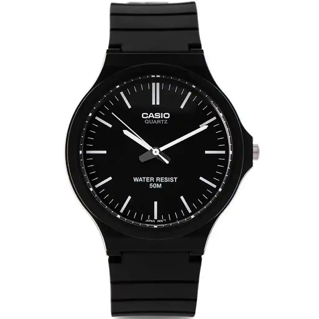 Modelo: MW-240-1E Colección: Clásico Tipo: Análogo Género: Unisex Color esfera: Negro Color pulsera: Negro Material caja: Resina Material pulsera: Resina Material vidrio: Resina Cierre: Ajustable Duración pila: 3 años aproximadamente Resistencia al agua: Resistencia 5 BAR Funciones: Funciones clásicas de reloj (hora, minuto, segundo). Medidas: 48mm x 43,6mm x 10,3mm Peso: 35 gramos aprox.
