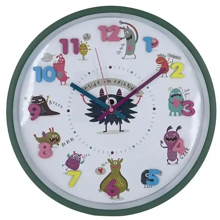Haz que aprender la hora sea una aventura divertida. Este encantador reloj de pared infantil está decorado con simpáticos monstruos de colores que captarán la atención de los más pequeños. Perfecto para habitaciones infantiles, salas de juegos o espacios educativos. Características: • Diseño único con personajes monstruosos en cada número. • Números grandes y coloridos, fáciles de leer. • Manecillas de hora, minutos y segundos para una lectura precisa. • Marco resistente con acabado vibrante. • Ideal para estimular el aprendizaje y la curiosidad de los niños. Medidas aproximadas: 30 cm de diámetro Funciona con 1 pila AA (no incluida) ¡Decora y educa al mismo tiempo con este reloj monstruosamente divertido