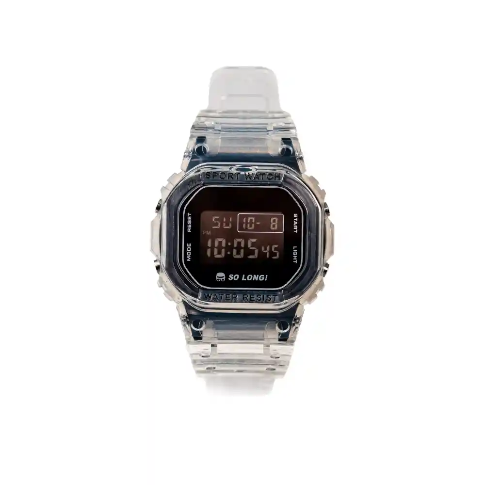 * Por compras desde $60.000 lleva tu llavero destapador So Long GRATIS! (Hasta agotar stock) * Reloj Digital So Long! Modelo Soul WR 50M Caracteristicas: • Color: Blanco Transparente • Resistente al agua (50 metros) • Resistente a golpes • Correa y estuche de resina • Hebilla de acero • Tapa trasera inoxidable • Cronometro • Alarma • Electroluminiscente • Formato Hora: 12 y 24 • Funciones de entrega: Hora, minutos, segundos, pm, mes, fecha y día • Duración de la pila: 2 años aproximadamente • Tipo de pila: CR2016 Contenido de tu compra: • Caja • Reloj • Manual • Stickers • Pulsera • Estuche duro con sierre Garantía: • 30 días por gusto • 3 meses falla de fabrica