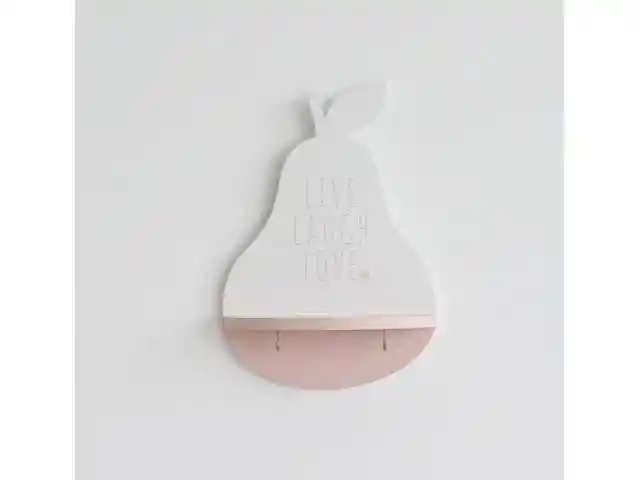 Esta repisa con su graciosa forma de pera, incluye dos ganchos para colgar pertenencias de ligero peso. Es de color rosado claro y crema, con detalles rosados en la parte superior de la repisa. Su tierna y emotiva frase indica "Live, Laugh, Love".