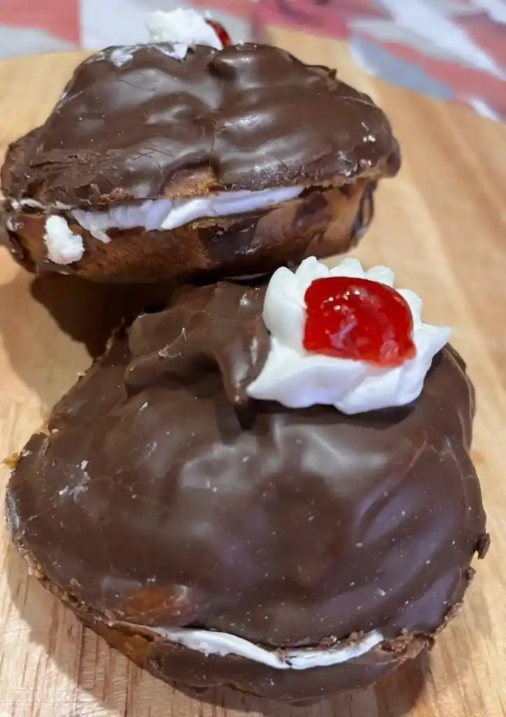 repollito en masa de hoja, relleno de manjar y crema chantilly bañado en chocolate