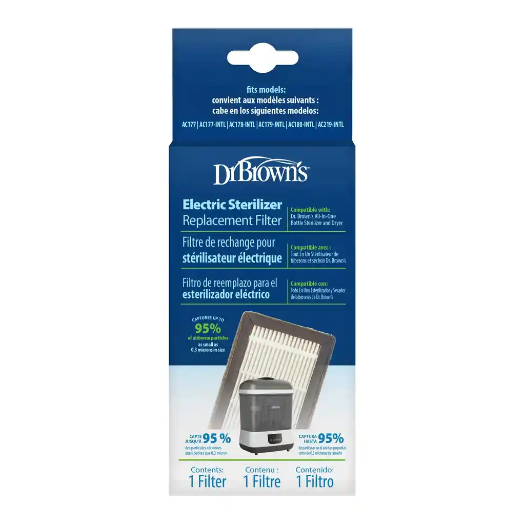 Mantén tu esterilizador y secador eléctrico Dr. Brown’s funcionando como nuevo con este repuesto de filtro HEPA de alta eficiencia. Diseñado específicamente para los modelos de esterilizador y secador de biberones Dr. Brown’s, este filtro captura hasta un 95 % de las partículas de aire, incluidas bacterias, polvo y otras impurezas, asegurando que el aire que circula durante el secado sea más limpio y seguro para tus mamaderas y accesorios. Un filtro HEPA en buen estado no solo mejora el funcionamiento de tu esterilizador, sino que también contribuye a un secado más higiénico y rápido, reduciendo la posibilidad de que restos de humedad y partículas se depositen en las piezas de alimentación de tu guagua. Para un rendimiento óptimo, se recomienda cambiar el filtro cada 6 meses, especialmente si usas el esterilizador con frecuencia. Este repuesto es fácil de instalar, con una práctica pestaña que permite retirarlo y colocarlo rápidamente, devolviendo al esterilizador el nivel de filtración ideal para el cuidado diario de los biberones, tetinas, chupetes y accesorios. Tips de uso Reemplaza el filtro HEPA cada 6 meses para mantener un rendimiento óptimo del esterilizador y secador. Antes de instalar, asegúrate de que el equipo esté desconectado y frío. Extrae el filtro usado con la pestaña incluida y coloca el nuevo con la misma orientación. Limpia el compartimento del filtro con un paño seco antes de instalar el repuesto. Utiliza agua destilada en el esterilizador para evitar residuos minerales que puedan afectar al filtro. Especificaciones Compatibilidad: Esterilizador y Secador Eléctrico Dr. Brown’s Tipo de filtro: HEPA de alta eficiencia (captura hasta 95 % de partículas de aire) Duración recomendada: ~6 meses de uso continuo Instalación: Reemplazo rápido y sencillo con pestaña integrada Incluye: 1 filtro de repuesto Marca: Dr. Brown’s Uso: Filtración de aire para secado más higiénico