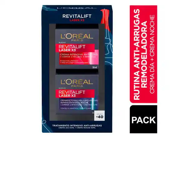 Pack Revitalift Contiene 2 Unidades: Crema Revitalift Laser X3 Día Crema 50 mL + Revitalift Laser X3 Noche 50 ml. Tratamiento Intensivo Anti Arrugas Remodelador Laser de LOréal Paris. La Crema Intensiva de Día Corrige Retexturiza y Remodela Gracias a la Adenosina y Pro Xylane Concentrado al 3%. La Crema Efecto Mascarilla de Noche Reconstruye la Barrera de la Piel Durante la Noche. Descubre la Alta Concentración de Activos y Triple Acción Anti Edad de Revitalift Laser y Combate Todos Los Signos Del Envejecimiento.