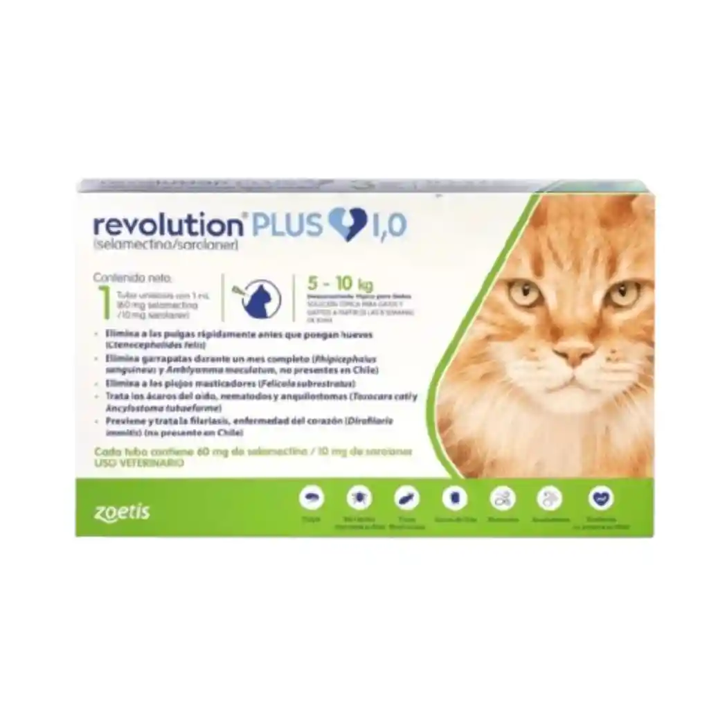 Revolution Plus para Gatos: Apoyo funcional para el control de parásitos internos y externos Revolution Plus es un producto de apoyo funcional para gatos y gatitos a partir de 8 semanas de edad, formulado para ayudar en el control de parásitos tanto internos como externos. Este tratamiento está diseñado para el control y prevención de pulgas, garrapatas, piojos masticadores, ácaros del oído, y para el apoyo en el control de filariasis causada por Dirofilaria immitis y de infecciones por nematodos intestinales. Indicaciones para el control de parásitos: Pulgas (Ctenocephalides felis). Piojos masticadores (Felicola subrostratus). Ácaros del oído (Otodectes cynotis). Nematodos intestinales (Toxocara cati y Ancylostoma tubaeforme). Revolution Plus también se puede utilizar como parte del apoyo al control de la dermatitis alérgica asociada a pulgas (DAPP). Dosis recomendada: La dosis corresponde a 6 mg/kg de selamectina y 1 mg/kg de sarolaner, de acuerdo con el peso del animal. A partir de las 8 semanas de edad. Frecuencia y duración del tratamiento: Pulgas (Ctenocephalides felis): Aplicar mensualmente. Piojos masticadores (Felicola subrostratus): Aplicar una dosis única. Nematodos intestinales (Toxocara cati y Ancylostoma tubaeforme): Aplicar una dosis única. La necesidad de repetir el tratamiento y la frecuencia deberán ser determinadas por el veterinario tratante. Ácaros del oído (Otodectes cynotis): Aplicar una dosis única. Para determinar si se requiere una segunda aplicación, se recomienda consultar con el médico veterinario para una evaluación 30 días después del tratamiento. Vía de administración: Tópica.