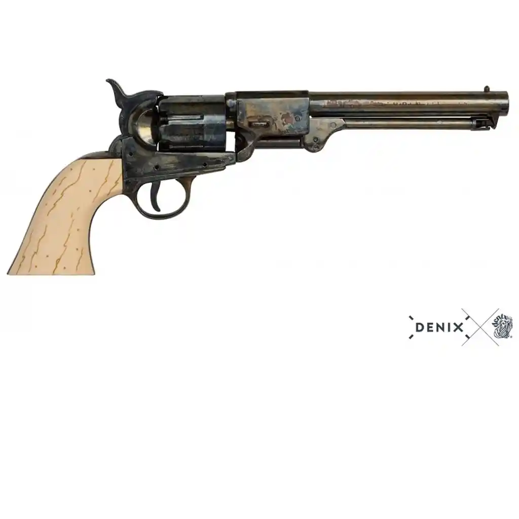 REVOLVER CONFEDERADO 1860 8083 Reproduccion revolver confederado de la guerra de secesión Marca Denix Modelo 8083 Material Metal Zamak Reproduccion para exhibición (no es producto de practica) Los Mecanismos de preparación de carga y disparo mantienen las características móviles del modelo original pero la reproduccion NO DISPARA Diseñada por Griswold & Gunnison en 1860 en USA Usado durante la guerra de secesión por los confederados Medida 35 centímetros Peso 1.022 gramos Fabricada en España Samuel Griswold fue un pionero industrial estadounidense en las décadas de 1820 a 1860 con sede en el centro de Georgia. Creó una exitosa fábrica desmotadora (separa las fibras de algodón de sus semillas). Al estallar la Guerra Civil estadounidense,(12 abril 1861 – 9 abril 1865) la fábrica desmotadora de algodón Griswold fue arrendada al gobierno confederado y remodelada para fabricar pistolas y municiones. El revólver producido se llamó Griswold and Grier Revolver, y más tarde se llamó Griswold Gunnison, en honor a Arvin Nye Gunnison, el socio comercial de Griswold. Los revólveres Griswold Gunnison son copias de tamaño reducido del Colt Dragoon, con cañón redondo, no octogonal (pero en calibre .36, no .44) y se fabricaron con marcos de latón distintivos debido a la escasez de acero en el Sur. También es típico del Griswold un cilindro fabricado con hierro retorcido en lugar de acero. Inspirado en el legendario Colt 1851 Navy, el Griswold & Gunnison fue la respuesta del Sur Confederado a la escasez de recursos bélicos. Ante la falta de acero, los fabricantes recurrieron al uso de latón —muchas veces fundido a partir de campanas de iglesias— para crear su característico armazón dorado. Así nació un revólver de percusión, de calibre .36, con tambor de seis disparos y cañón redondo, de 7,5 pulgadas, tan funcional como distintivo. Entre 1862 y 1864, esta arma se convirtió en el revólver más manufacturado por parte de la Confederación, con unas 3.700 unidades salidas de la fábrica. Su empuñadura, ligeramente inclinada hacia atrás, le otorgaba una ergonomía particular y una personalidad única frente a otras armas de su época. El Griswold & Gunnison ha dejado huella en la ficción: en la serie Hell on Wheels, el protagonista Cullen Bohannon —exsoldado confederado— lo lleva siempre consigo, reflejando su pasado y su vínculo con el conflicto que marcó el siglo XIX, en Estados Unidos.