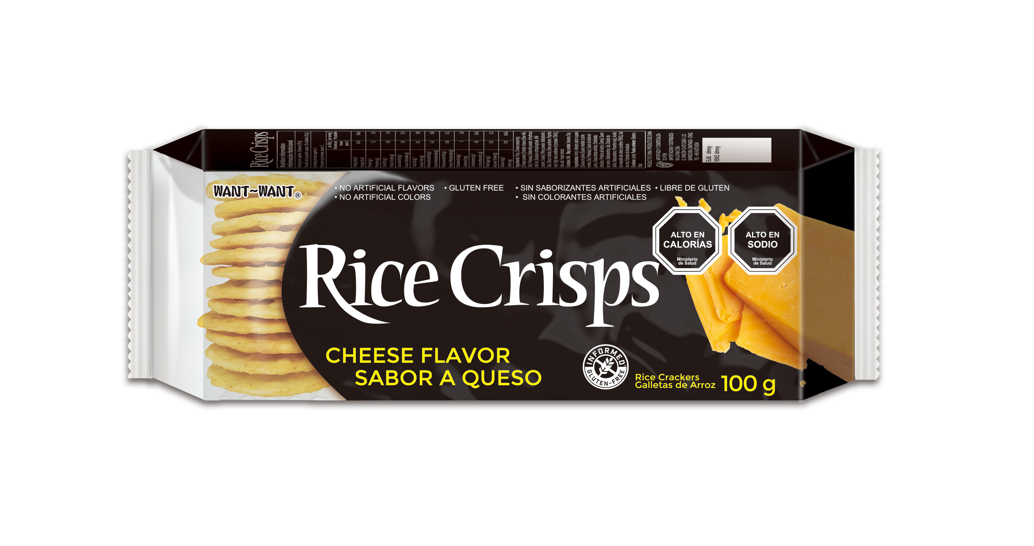 Galletas de arroz sabor Queso. Su exquisito sabor y crujiente textura son ideales para disfrutar un rico snack o compartir un aperitivo con tus amig@s. Libres de Gluten y de GMO. Horneadas, Libres de Grasas Trans y 0% Colesterol.