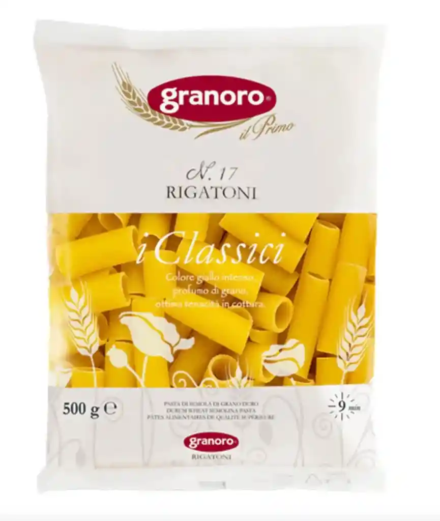 El Rigatoni es una pasta corta clásica que destaca por sus ranuras y gran superficie interior. Estas características hacen que sea la opción perfecta para cualquier receta que busque realzar y absorber los sabores de las salsas y condimentos. Su forma única permite que cada bocado de Rigatoni se impregne con la esencia de tus salsas favoritas, desde las más sencillas hasta las más elaboradas y llenas de sabor. El Rigatoni es especialmente adecuado para platos gratinados, al horno o para acompañar salsas más densas y consistentes. Marca: Granoro. Producto: Rigatoni. Contenido: 500 gr Tiempo de cocción 10 minutos