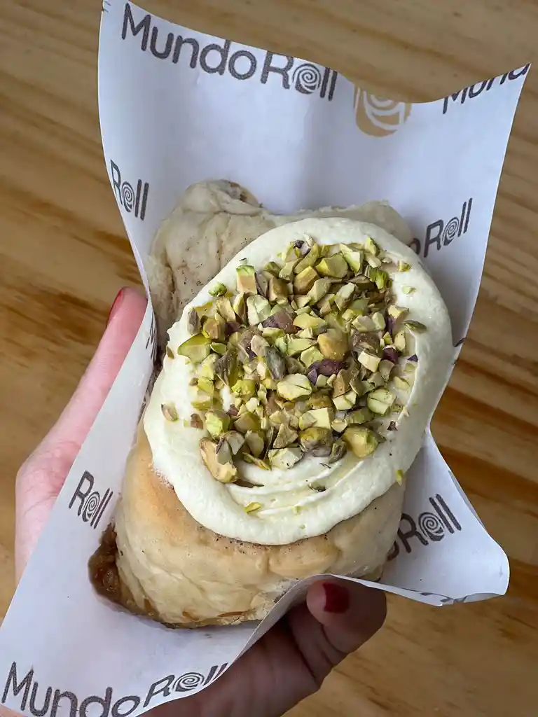 Rollo de canela de 8-10cm. Topping: icing de queso crema con pistacho picado.