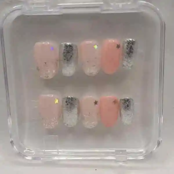 Uñas hechas a mano con finos detalles en glitter. Forma: Ovalada , Talla: L Kit Incluye: 10 uñas, 24 stickers, lima, palo de cuticula, alcohol pad. 100% veganas, libres de crueldad animal, listas en 10min y duran hasta 2 semanas.